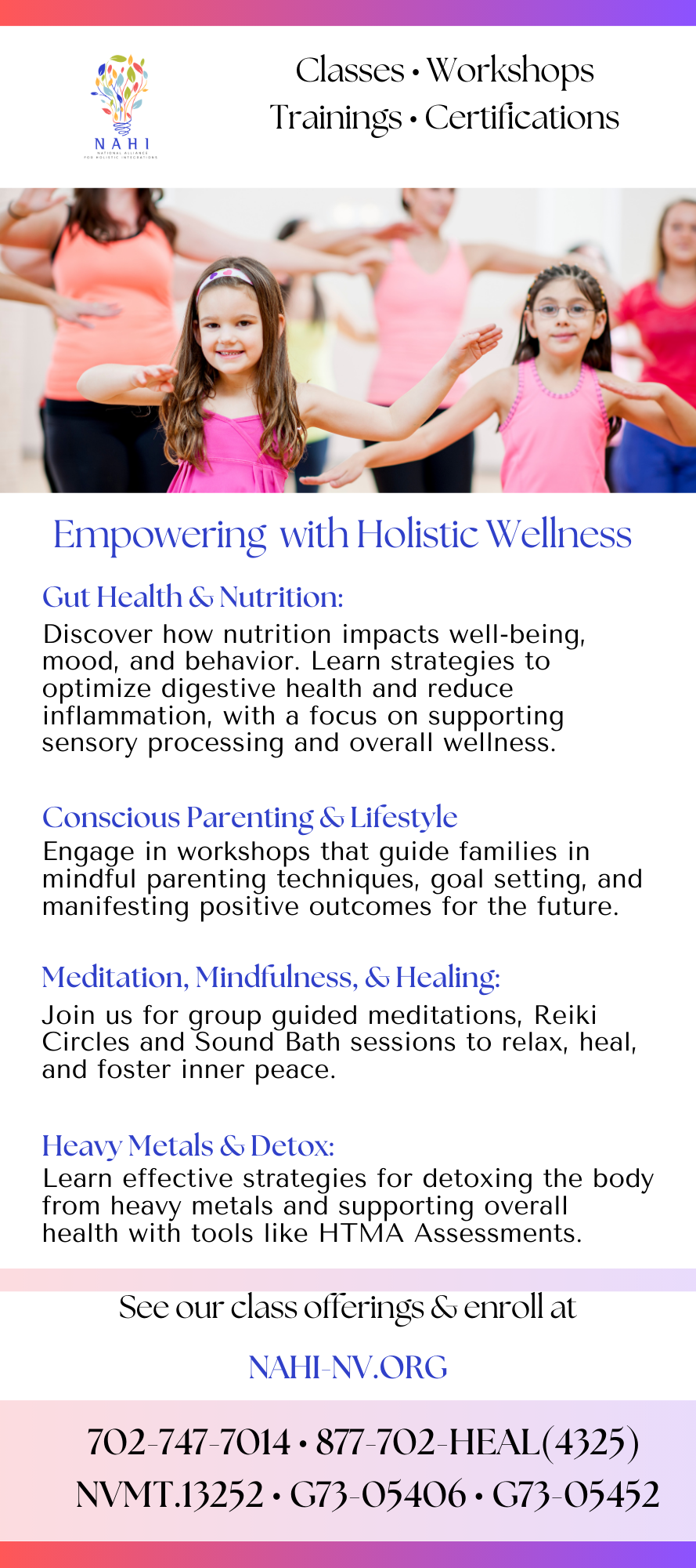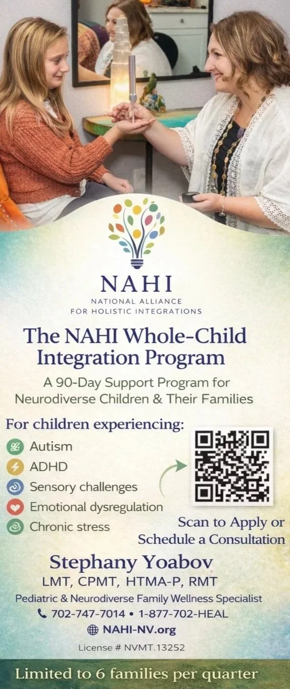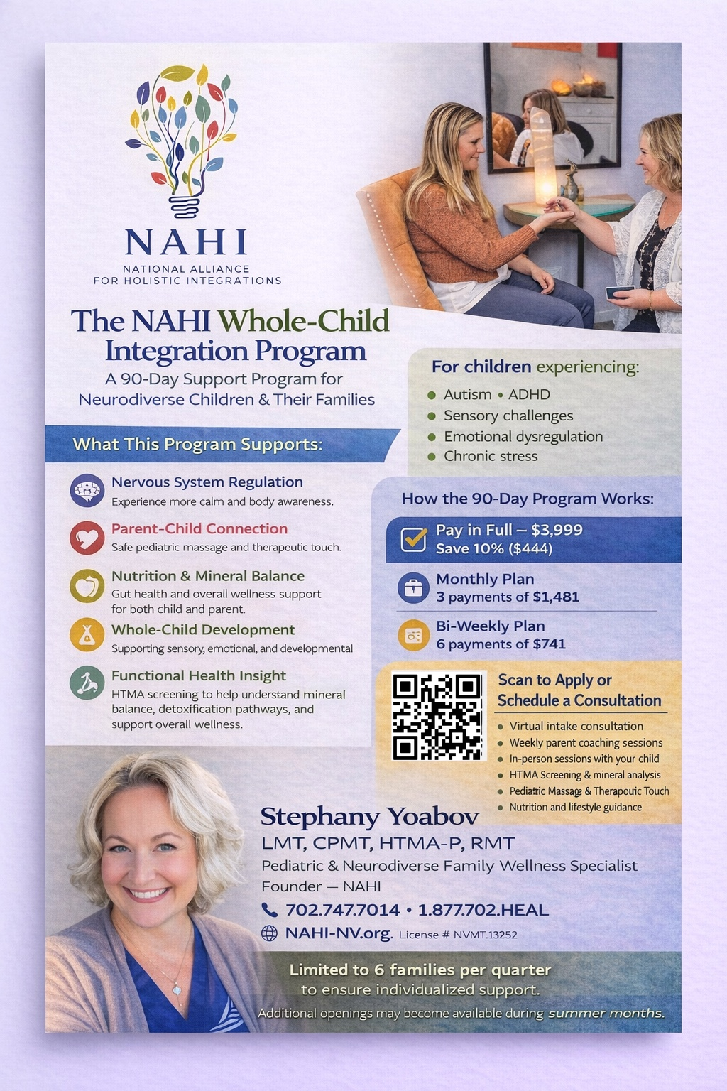 The NAHI Whole-Child Integration Program is a 90-day guided wellness experience designed to support neurodiverse children and their families through a holistic, integrative approach. This program focuses on calming and regulating the nervous system, strengthening parent-child connection, and supporting the body through nutrition, mineral balance, and gentle detoxification pathways. By combining functional health insight, HTMA Screening, Pediatric Therapeutic Touch, and Personalized Coaching, we help families better understand their child’s unique needs while creating sustainable strategies for long-term wellness, resilience, and improved quality of life. Children do not have to have a formal diagnosis to participate or to benefit from this program. While the program has a curriculum and set modalities to it, it is designed with a custom approach to each unique family’s needs.
