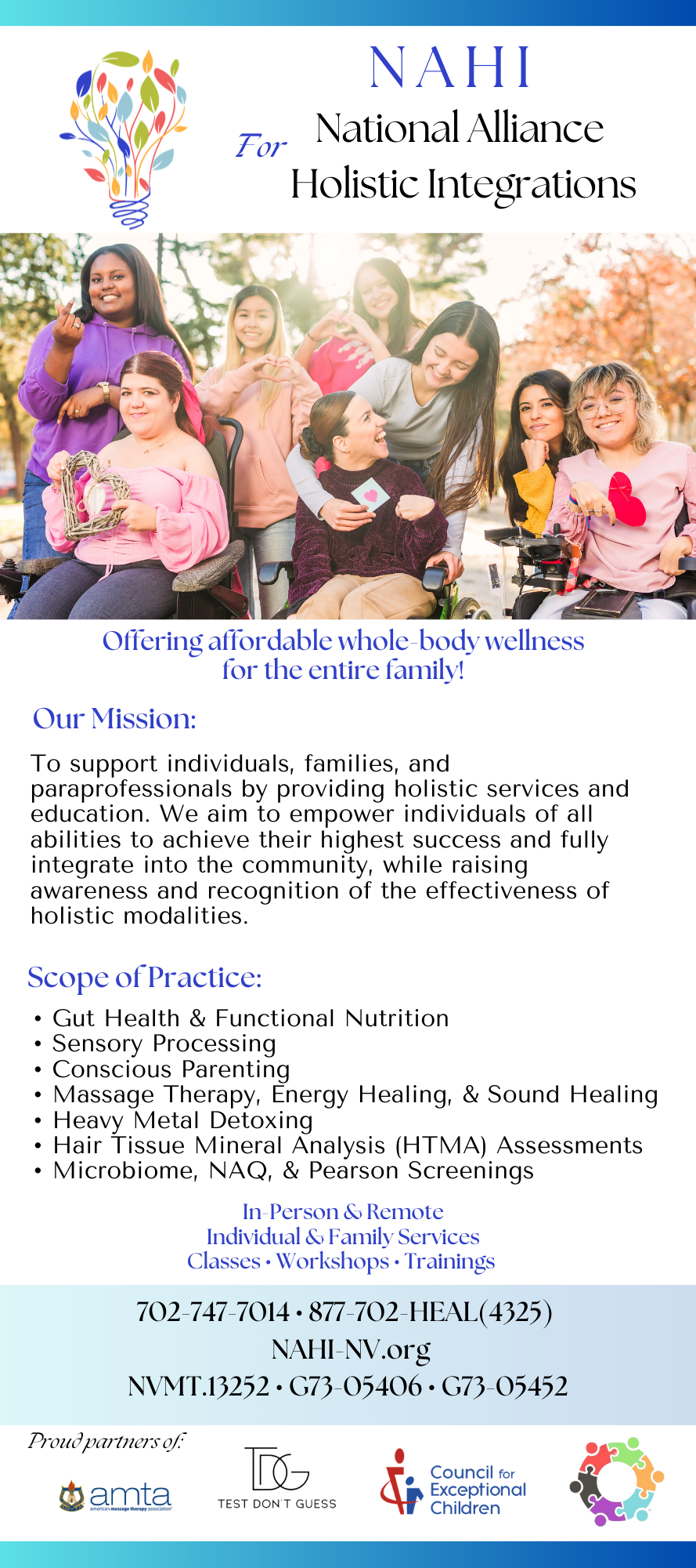 To support individuals, families, and paraprofessionals by providing holistic services and education. We aim to empower individuals of all abilities to achieve their highest success and fully integrate into the community, while raising awareness and recognition of the effectiveness of holistic modalities. We work with non-profits, educators, and other wellness providers to bring supports to the community, to learn more about what more we do click the button or feel free to reach out with any questions you may have.